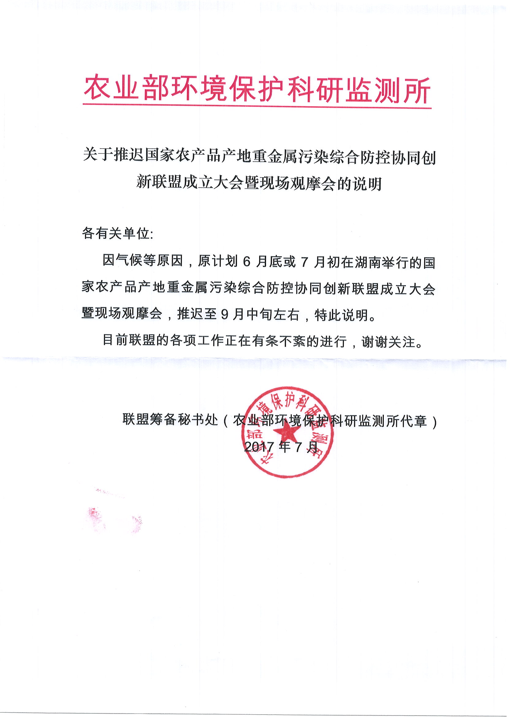 关于推迟国家农产品产地重金属污染综合防控协同创新联盟成立大会暨现场观摩会的说明