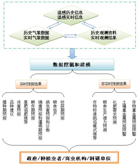 (1)研究建立生态平衡施肥、土壤墒情诊断和预报、病虫害预报、粮食估产、重金属中期预报等模型;(2)研究建立气象资料、地学资料、农情监测信息、遥感遥测数据等的数据挖掘方法;(3)研究建立农情诊断、预测预报指标体系和参数体系;(4)研制系列软件产品和信息化平台。
